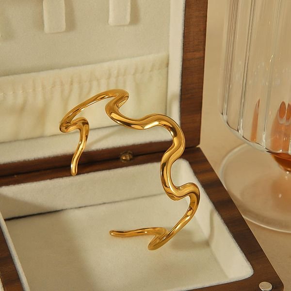 Fashionable Simple Wave Shaped 18k Gold Plated Bangles Open Wave Hand Grinding Polishing Stainless Steel Bangles
