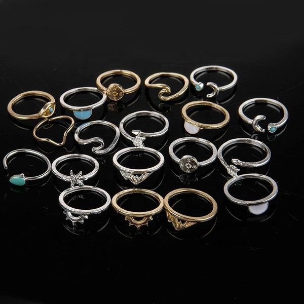 Female Arrow Sun Starfish Compass Moon Eye Wave Designer Jewelry Ring Set Vintage Gold Plated Alloy Sample Engagement Rings