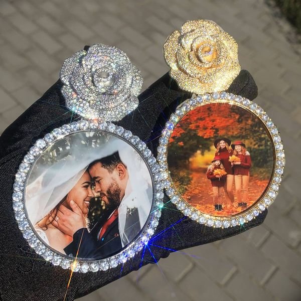 New Design Ins Hot Iced Out Memory Photo Pendant Necklace Custom Photo Rose Shaped Charms Pendant for Gift
